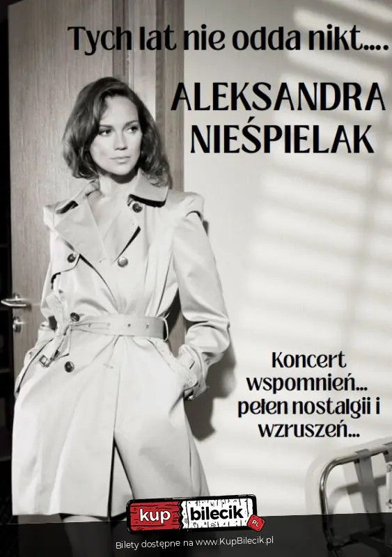 bilety: "Tych lat nie odda nikt" - recital Aleksandry Nieśpielak. Tych lat nie odda nikt artyści: Aleksandra NieśpielakWyjątkowy wieczór pełen wspomnień, wzruszeń i najpiękniejszych polskich melodii. Koncert „Tych lat nie odda nikt” to muzyczna podróż przez ponadczasowe przeboje, które od lat łączą pokolenia i wciąż poruszają serca słuchaczy. Recital pełen elegancji, nostalgii i artystycznej klasy – idealny dla miłośników pięknych tekstów, subtelnych aranżacji i emocji przekazywanych ze sceny prosto do serca publiczności. Bilety do nabycia na: KupBilecik.pl |